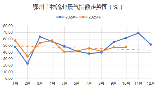 2025年10月,鄂州市物流业景气指数为47.46%,与上月持平,虽仍处于收缩区间,但行业运行中积极因素持续累积,新订单回暖、固定资产投资发力、航空运输与邮政快递业增势明显,物流业在整体承压的背景下,仍展现出较强的韧性和潜力。分项指标新订单、平均库存量、资金周转率、固定资产投资完成额、从业人员指数回升,库存周转次数、设备利用率、主营业务利润、物流服务价格指数回落。