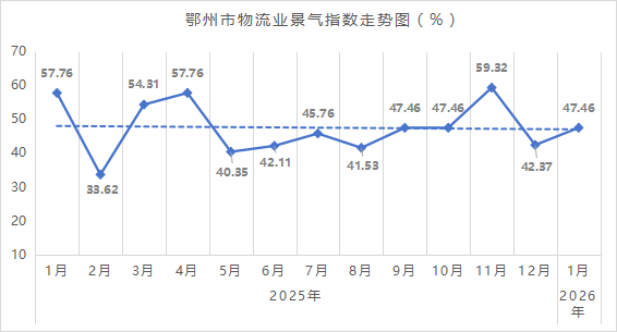 2026年1月,鄂州市物流业景气指数为47.46%,环比回升5.09个百分点,尽管仍处于收缩区间,但释放出积极筑底信号。分项指标呈现出鲜明的结构性分化特征,得益于节前备货旺季,业务量、库存指标普遍回暖;服务价格与成本压力仍存,反映出行业复苏基础尚不牢固。行业内部“冷热不均”现象突出,与民生消费相关的仓储、批发零售等领域回暖明显,而与基础建设相关的建材、大宗商品等板块则持续低迷。本月,鄂州花湖机场密集开通三条洲际货运航线,为低迷市场注入了一针强心剂,后市预期有所回暖。