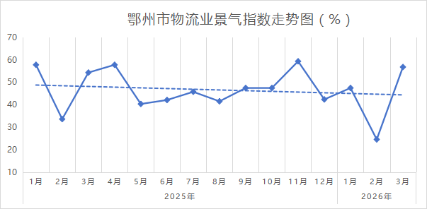 2026年3月,鄂州市物流业景气指数为56.8%,环比回升32.2个百分点,重返扩张区间,且高于上年同期2.5个百分点,高于全省平均水平1.4个百分点。随着春节假期后复工复产全面推进,物流需求集中释放,行业运行快速恢复至正常水平。分项指标呈现全面回暖态势,业务总量、新订单、库存周转次数及设备利用率等核心指标均大幅回升,物流服务价格指数在节后运力充裕影响下小幅回落,主营业务成本和主营业务利润指数有所回升。业务活动预期指数仍处于高位扩张区间,企业对后市普遍持乐观态度。
